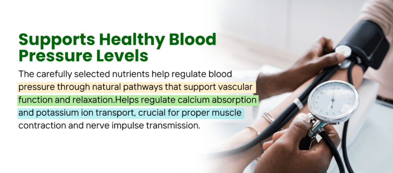 The carefully selected nutrients help regulate blood pressure through natural pathways that support vascular function and relaxation. - Promotes Cardiovascular Function: