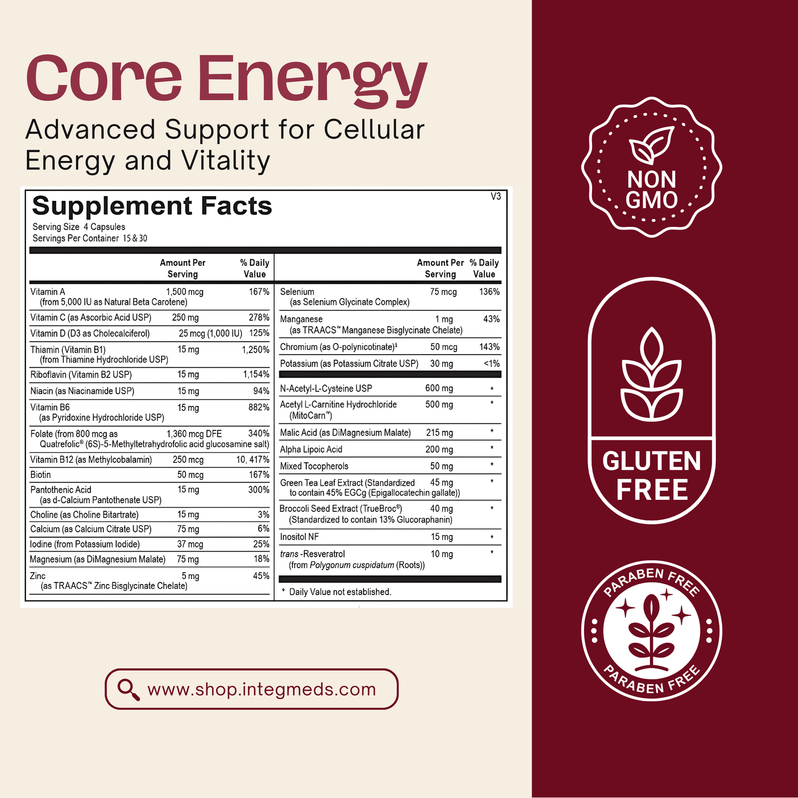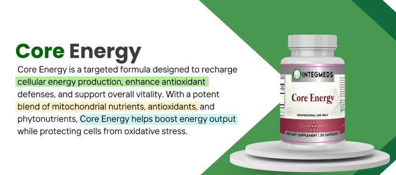 Core Energy is scientifically formulated, based on published research, to boost mitochondrial reserves and recharge cellular energy production. Core Energy includes the powerful antioxidant trio of alpha lipoic acid, N-acetyl cysteine and acetyl L-carnitine, all shown to recharge cellular energy production and the primary cellular antioxidant pools of vitamins E, C and glutathione. Core Energy also includes key micronutrients and phytonutrients, including green tea, broccoli seed extract and resveratrol, to protect the mitochondria and continually renew the cycle of energy production.