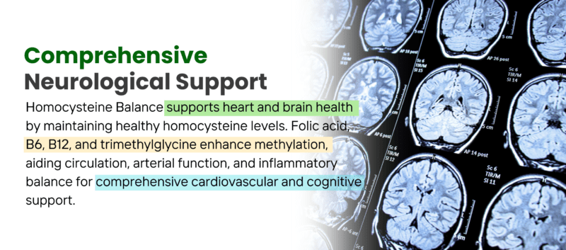 - Supports Neurologic Health: Homocysteine imbalance is linked to cognitive decline. Maintaining healthy levels can help protect against neurodegeneration and maintain brain health.