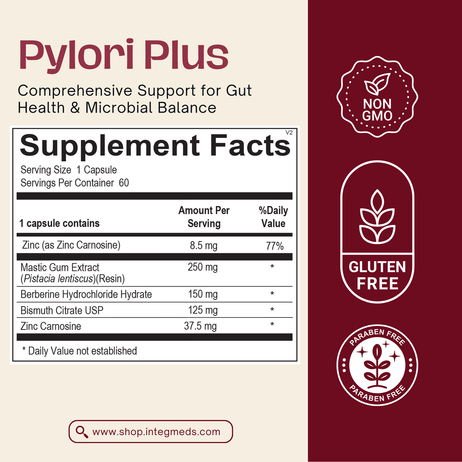 Pylori Plus includes ingredients such as mastic gum, bismuth citrate and zinc carnosine to promote microbial balance in the gastrointestinal tract and the stomach.