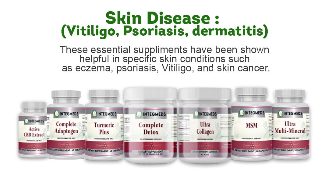 Skin Disease: Vitiligo, Psoriasis, dermatitis, etc. – MSM, Active CBD Extract, DERMA A 12 500IU, Ultra Collagen, Tranquil Plus, Digest Optimizer, Turmeric Plus, Complete Adaptogen, Complete Detox, Ultra Multi-Mineral,