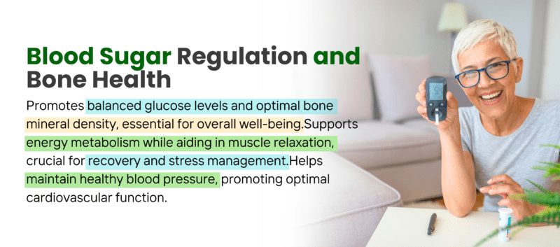 Supports energy metabolism while aiding in muscle relaxation, crucial for recovery and stress management. - Blood Sugar Regulation and Bone Health: